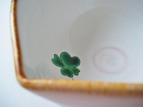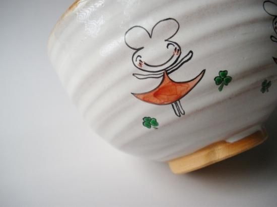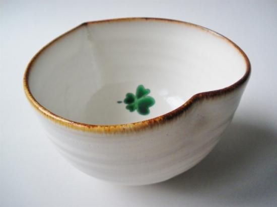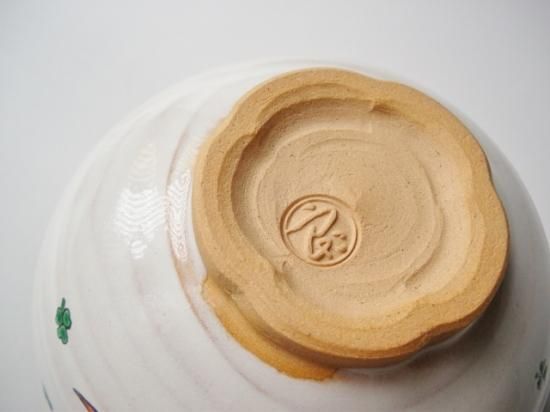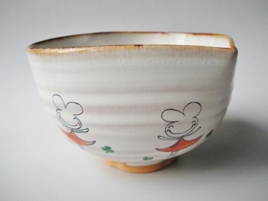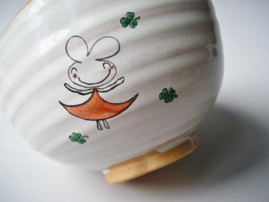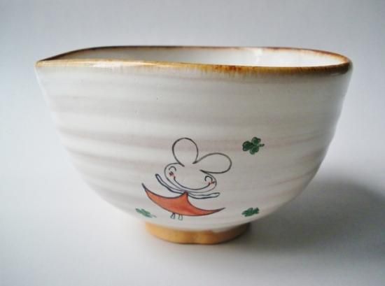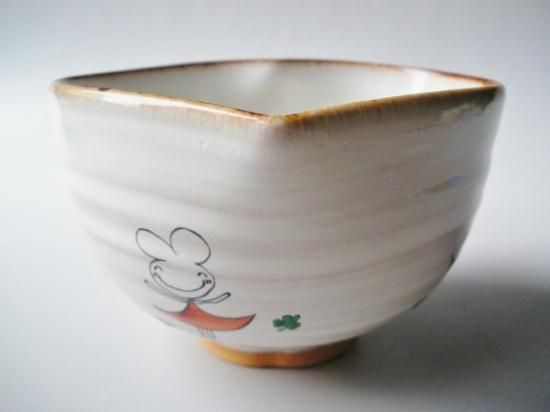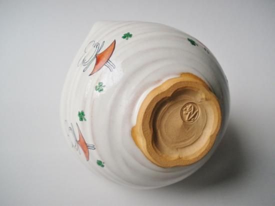 側面に愛らしいウサギさんが3匹楽しそうに描かれ、見込みには四つ葉のクローバーが一つありお抹茶をいただかれたあとに見つかるようになっています。