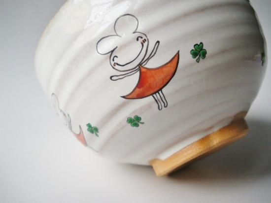 愛らしいハート形の茶碗で人気のある「Happy茶碗」を基本形として某和菓子店様のデザインされたキャラクターを使用したコラボ企画で出来上がった茶碗です。