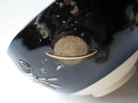 浮彫の天体望遠鏡の周りには人気のある土星を中心に星が描かれていて、その周りや口縁には銀河をイメージした砂子が焼き付けられています。