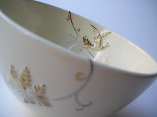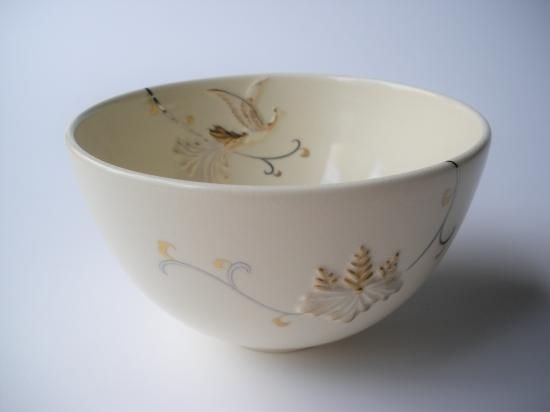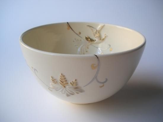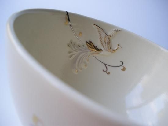 柔らかな白い肌に、最小限の絵付けと金銀の色彩で格調高い茶碗に仕上がっています。