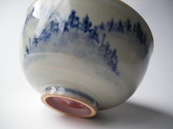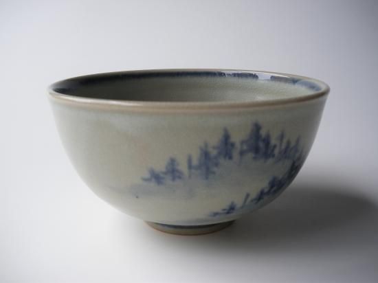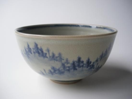 胴に絞り手の滲みをいかした林の絵が描かれ、濃淡によって山水画のような奥行き感がある茶味のある茶碗です。