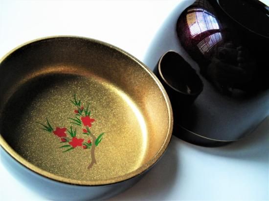見込みは金砂子となっていて蓋裏には桃の花が描かれています。