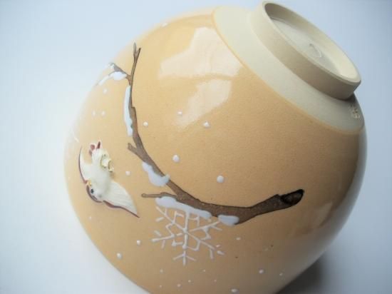 正面には浮彫されたふっくらとした雀が飛んでいて、見込みにも同じく浮彫で木にとまる3匹の雀が仲良くくっついている愛らしい姿が描かれています。