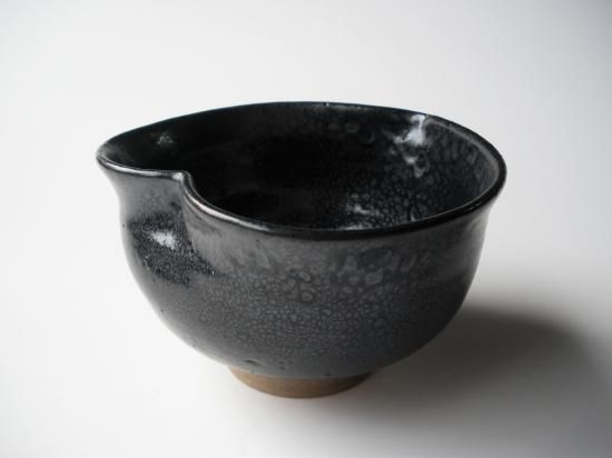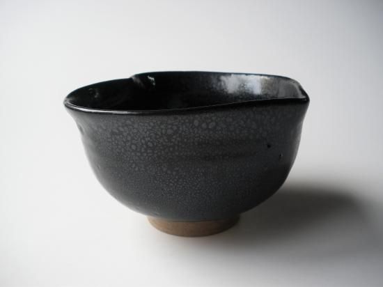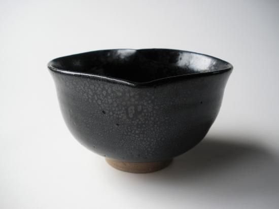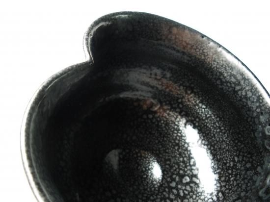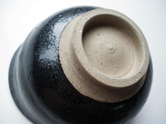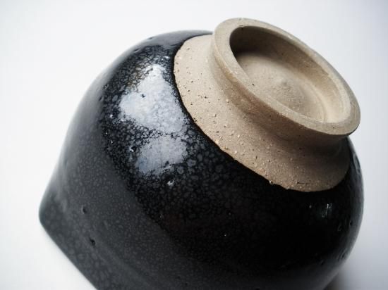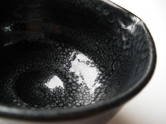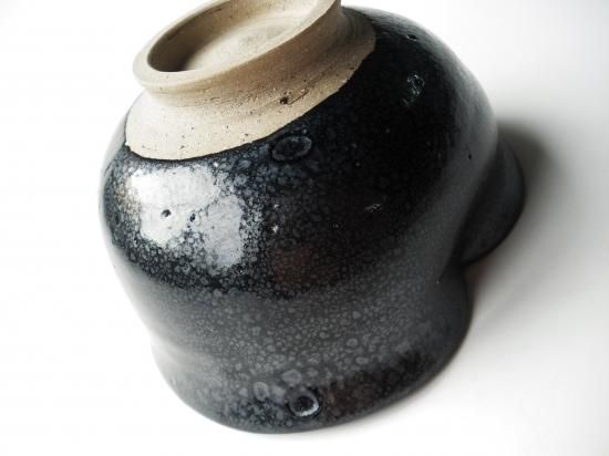 本茶碗は高台周辺は除き全体に黒い釉薬がかかり一面に銀色に輝く斑紋が浮かんで見える油滴釉の茶碗です。