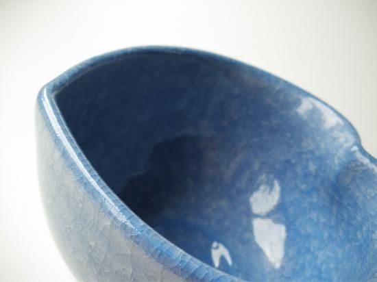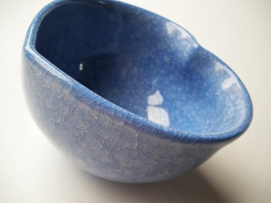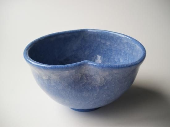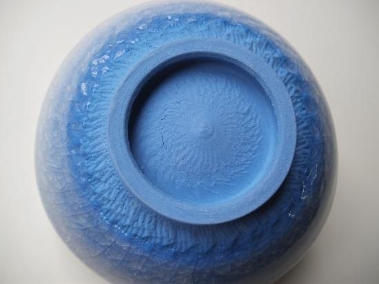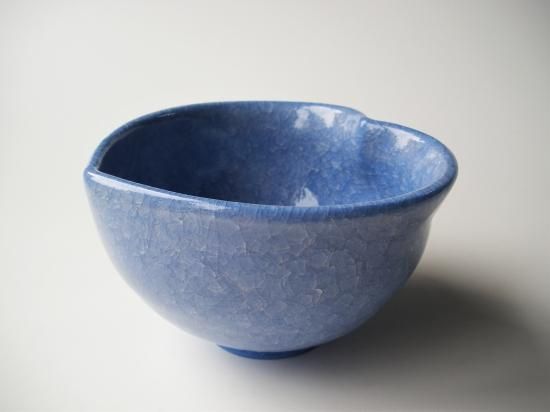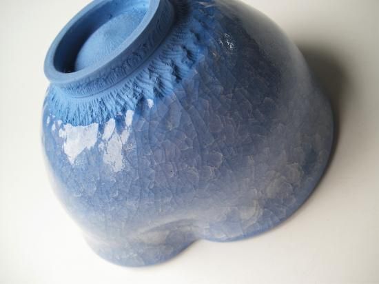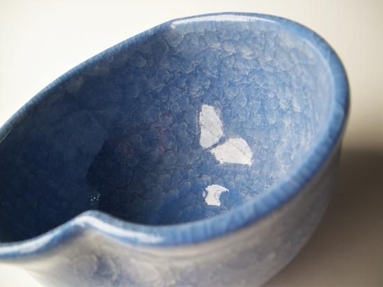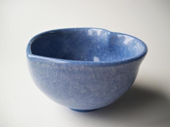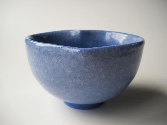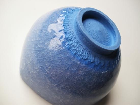 本茶碗は青い顔料が練りこまれた色土で造られていて、たっぷりと厚みのある氷裂釉か掛けられ浮かび上がった貫入がとても美しい景色で見ていて飽きません。