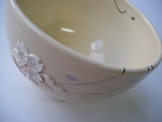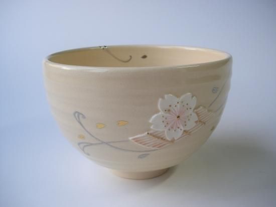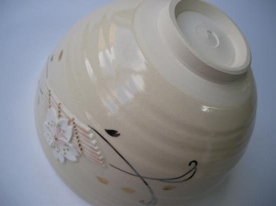 正面には浮彫された筏と大き目の桜の花が一輪描かれうっすらとしたピンクが上品で金を上手に使ってあり品があります。