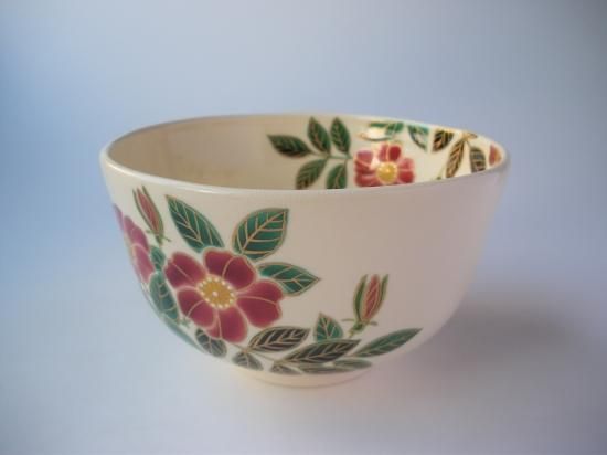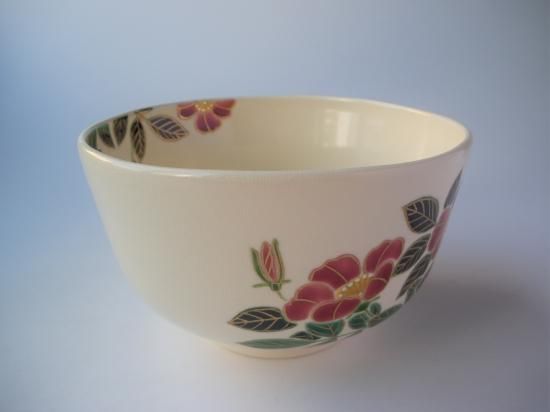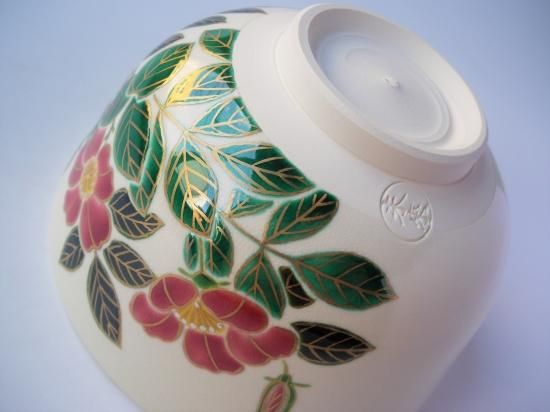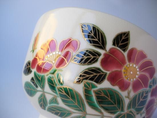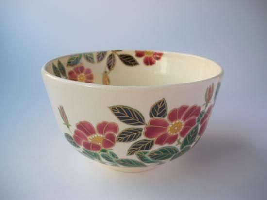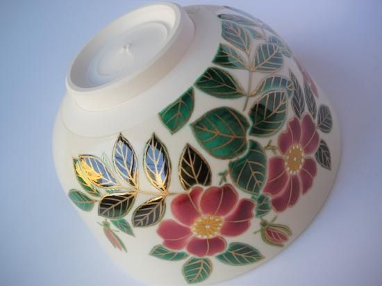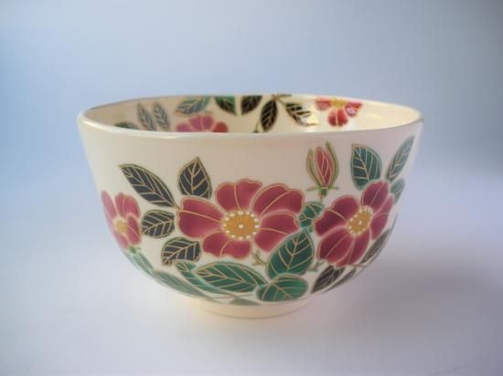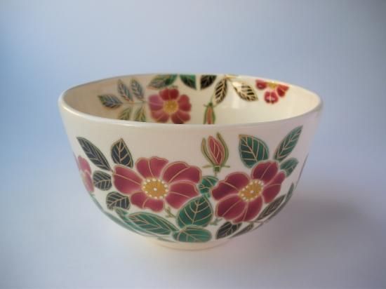 白い生地に紅紫色のハマナスと緑の葉っぱがとても映えています。