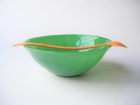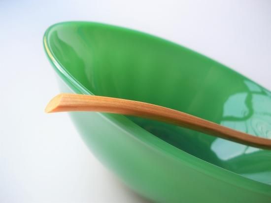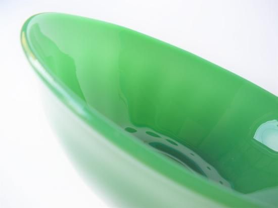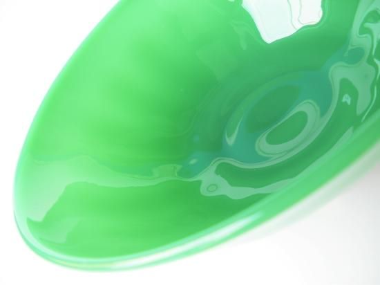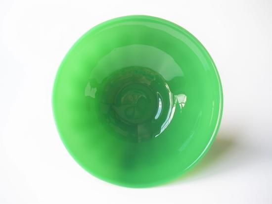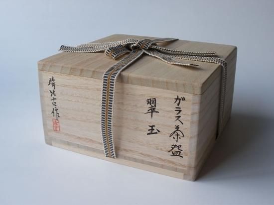 まさに作品名の通り翠玉というに相応しい深い緑の輝きが美しいガラス茶碗です。