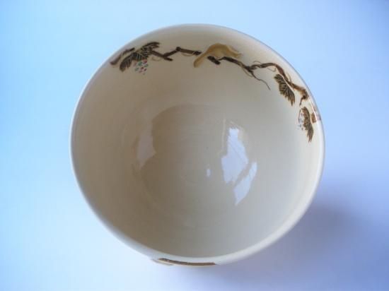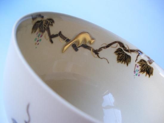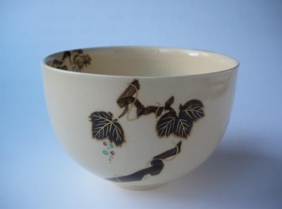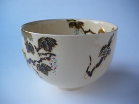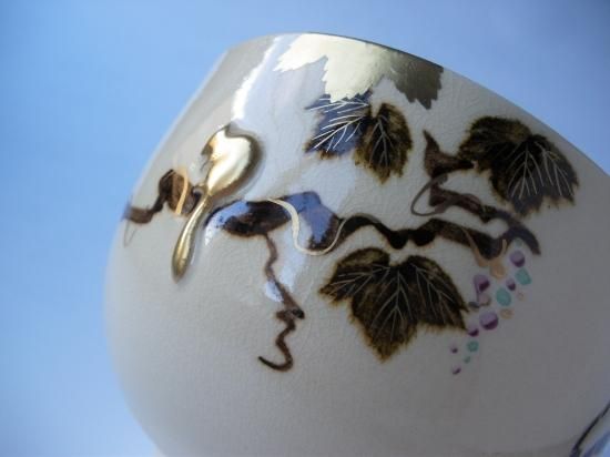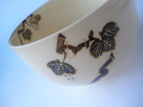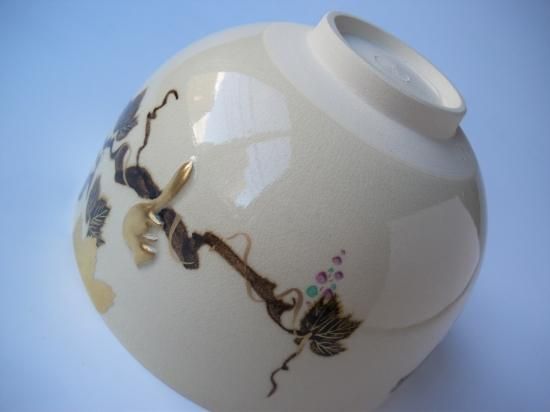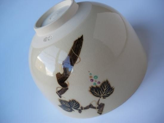少ない色使いの中にあって、ブドウの実の薄い水色と紫がとても効果的で、全体の黄色味を帯びた雰囲気に良くあった色使いが見事に調和した茶碗です。