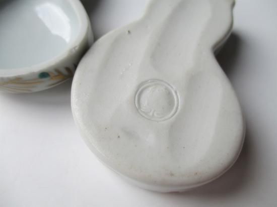 瓢形の磁器香合で、金彩で松唐草が描かれ赤・緑・黄色がアクセントになっています。
