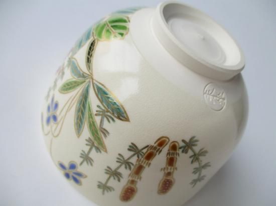 優しいクリーム色をした釉薬の上に春の草花が描かれています。