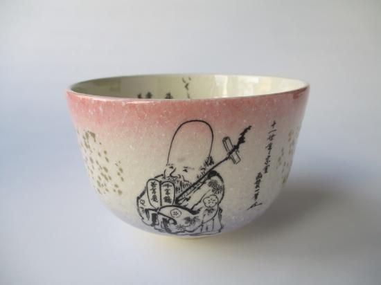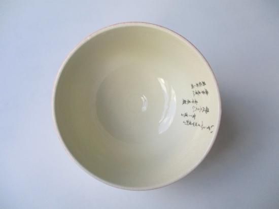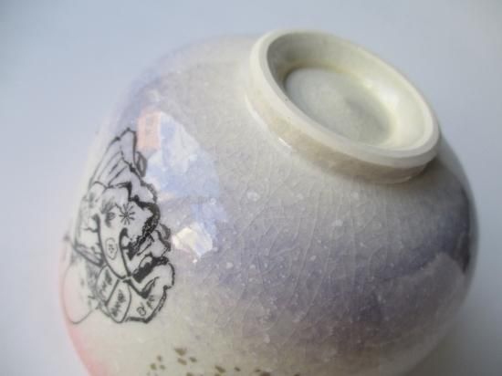 表面は粉雪が降っているかのように釉薬が掛かっており口縁あたりは淡いピンク、高台付近は淡い紫のグラデーションになっています。