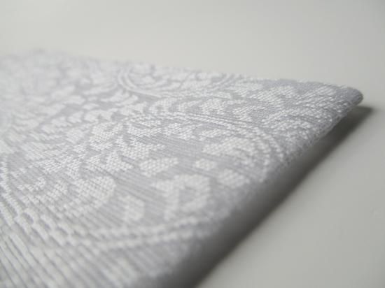 名物裂としても大変多く見る牡丹唐草紋が白一色で織り込まれ、陰影によって浮き出た文様が美しく、気品ある雰囲気に仕上がっています。