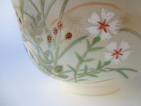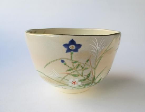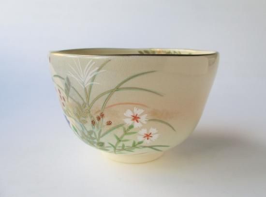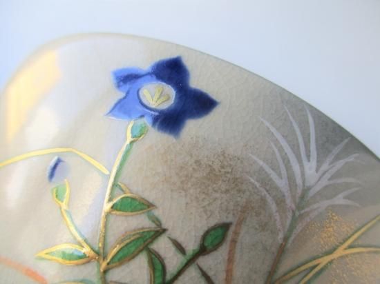 満月を背景に桔梗、吾亦紅、芒、撫子が情緒豊かに描かれています。