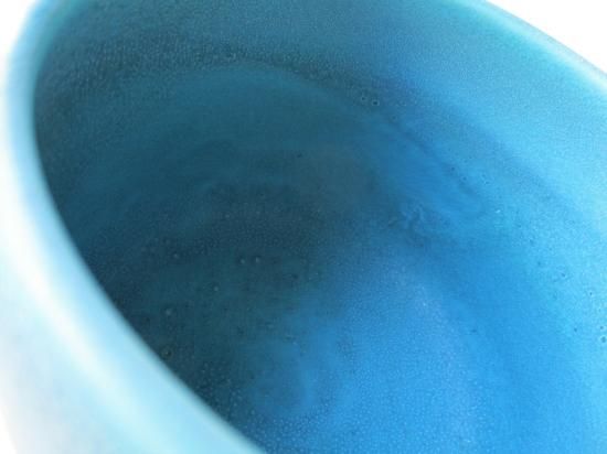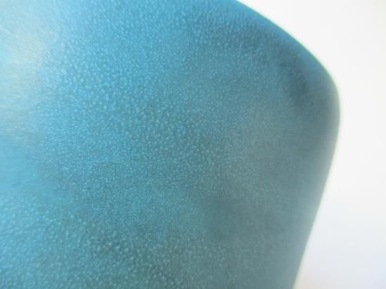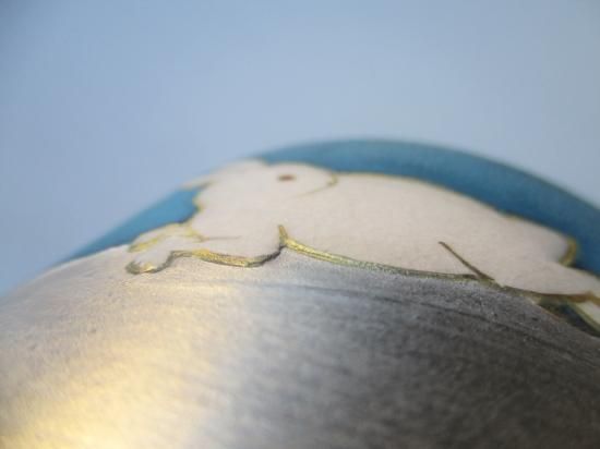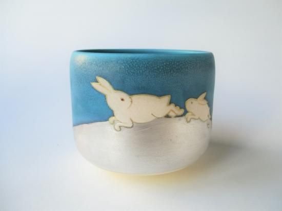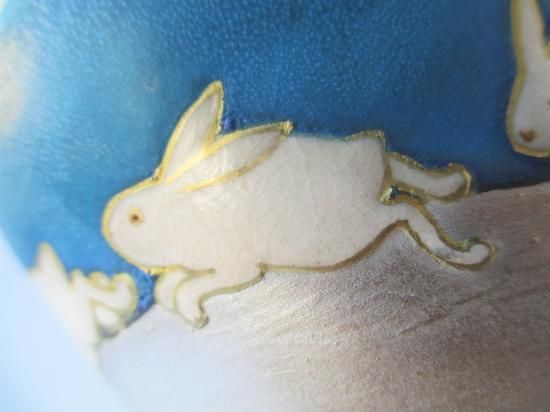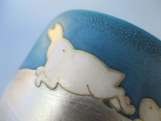 トルコブルーのような色合いの青釉は深い味わいがあり、銀色で描かれた丘を走る白うさぎが良く映えています。