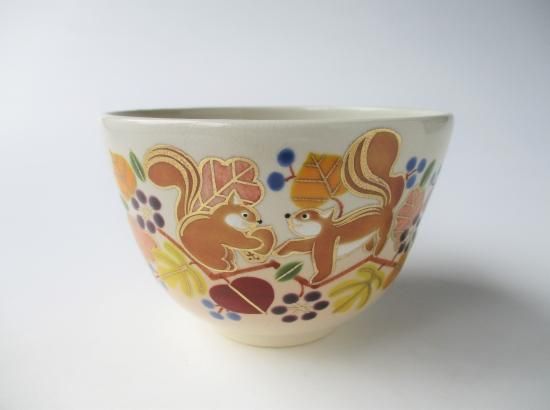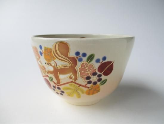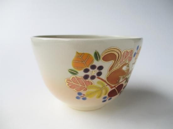 カラフルで秋を感じさせる色使いの可愛らしい茶碗です。
