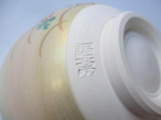 胴回りはパールのような質感で金の刷毛目がさらっと施されて、見込みは御本の景色があらわれ温かみがあります