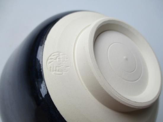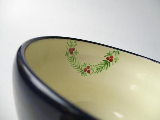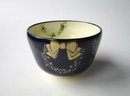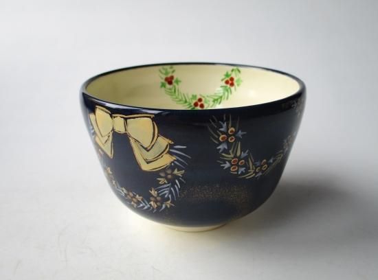 可愛らしいクリスマスリースがバランスよく描かれていて、側面の瑠璃色と見込みのクリーム色とのコントラストが美しい茶碗です。