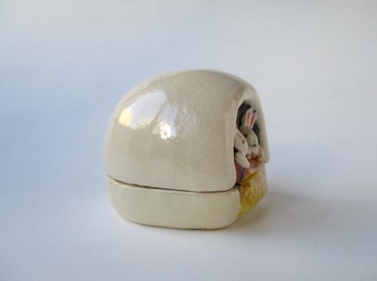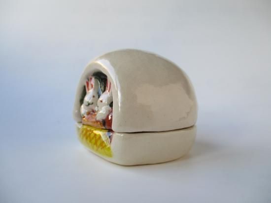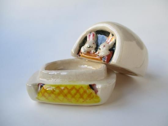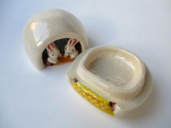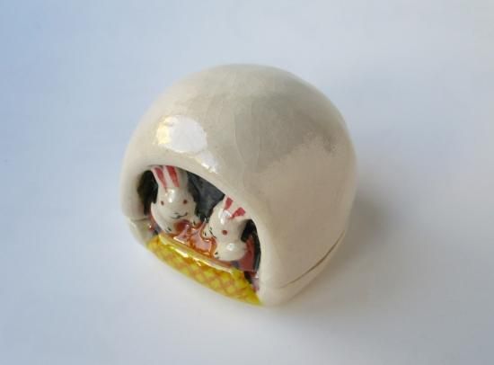 かまくらの中で可愛らしい2匹のウサギがコタツに入って温まっています。