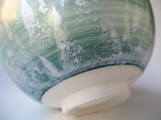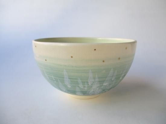 淡いライトグリーンの釉薬で刷毛目をして雪の積もった木々がパールのようなシルバーの釉薬で描かれています。