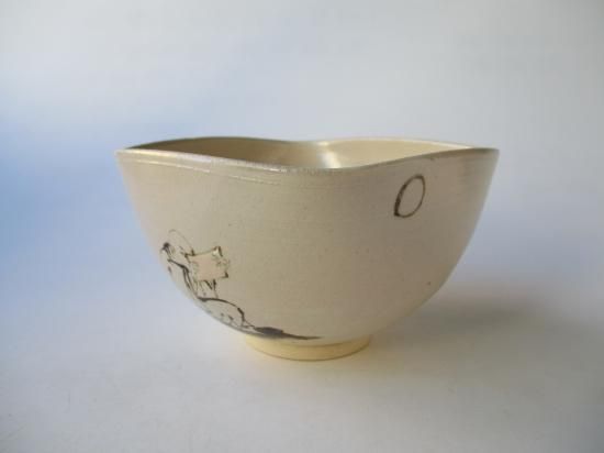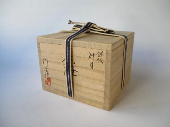 口四方の優しいフォルムに対月の図が銹絵で描かれた味わいのある茶碗です。