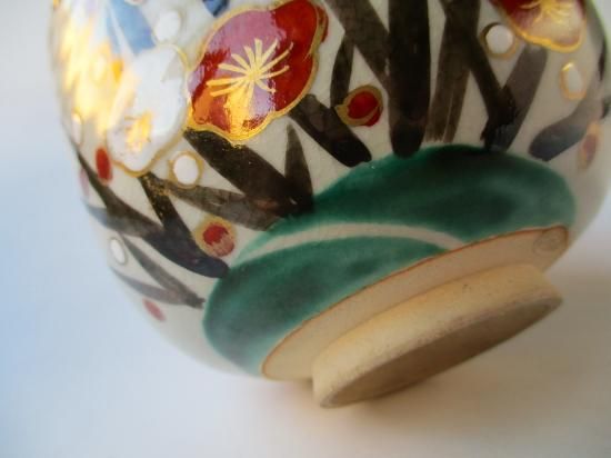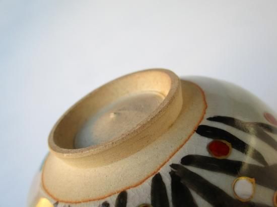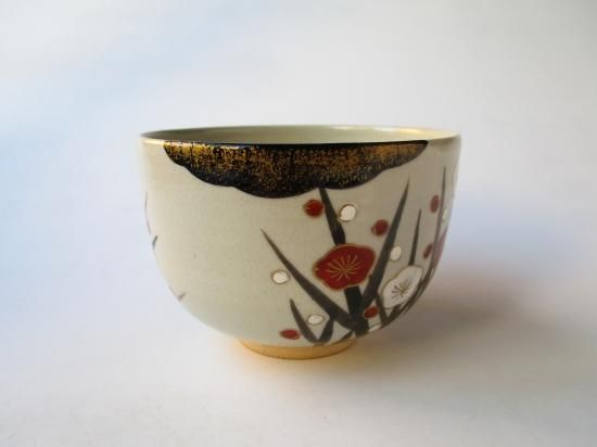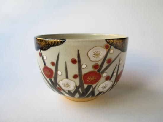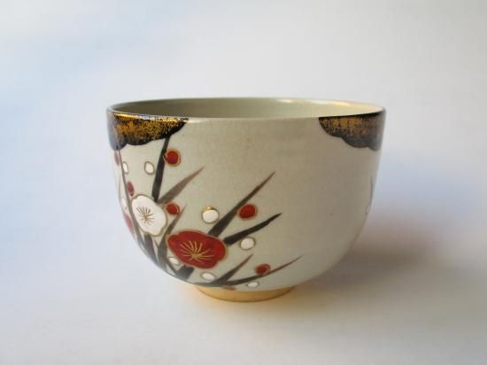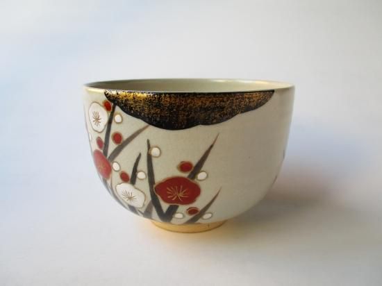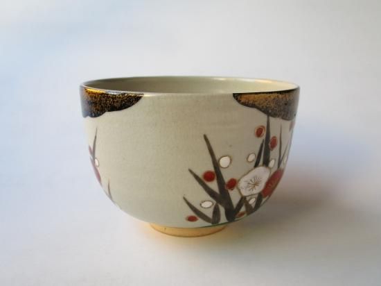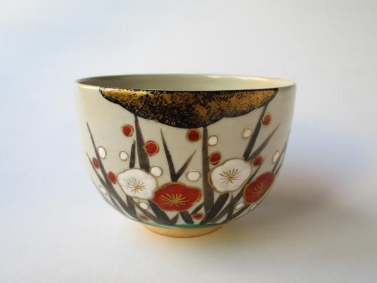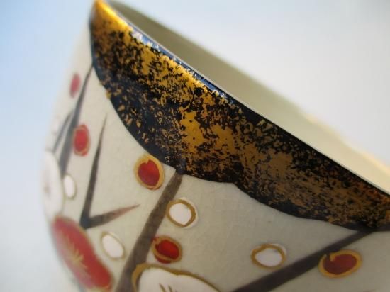 紅白の槍梅が前後に描かれていて、金を上手に使ってあり古格のある茶碗に仕上がっています。