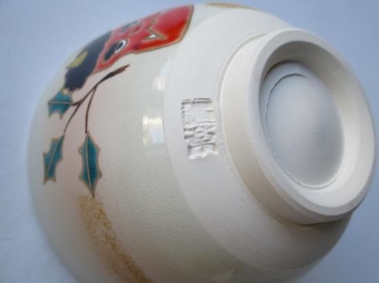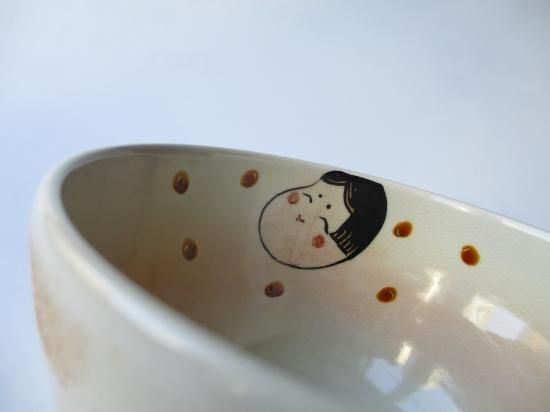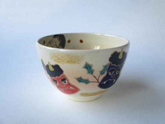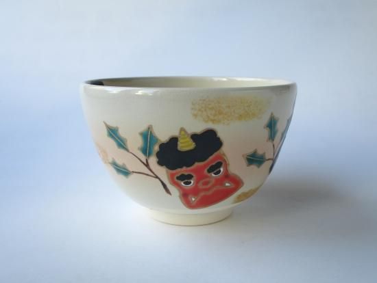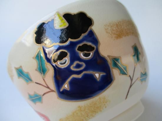綺麗な発色をした赤鬼、青鬼のまわりには魔除けの柊が描かれ、見込みには愛らしいお福さんがいます。