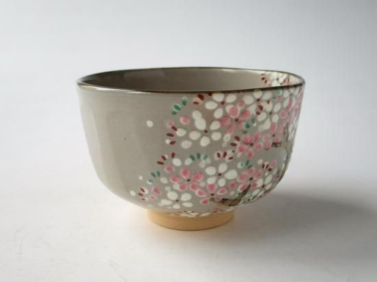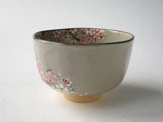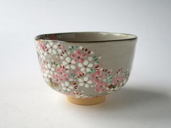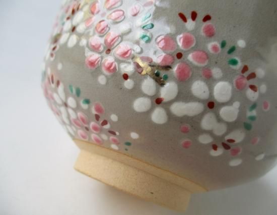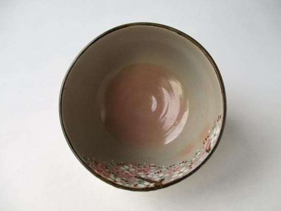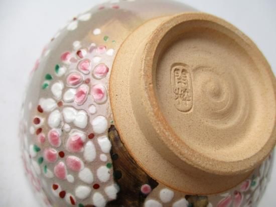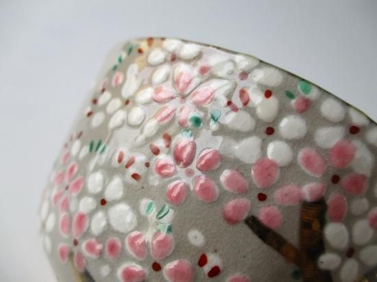 ピンクと白の釉薬で満開に咲き誇る桜、そして金を上手に使って描かれた幹、温かみのある御本がでた鼠色の生地によく似あっていて、可愛さの中に味わいのある雰囲気の茶碗に仕上がっています。