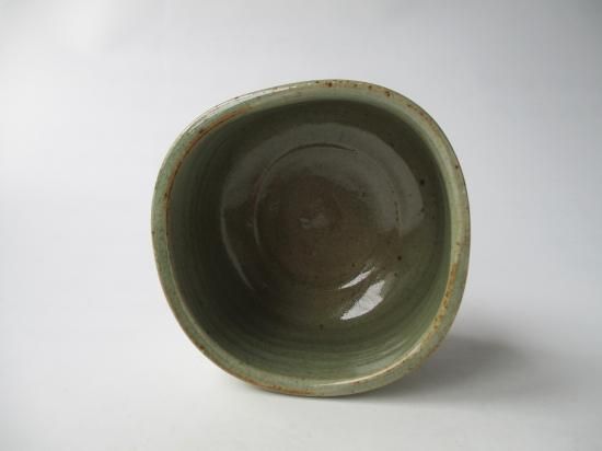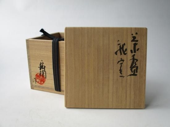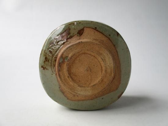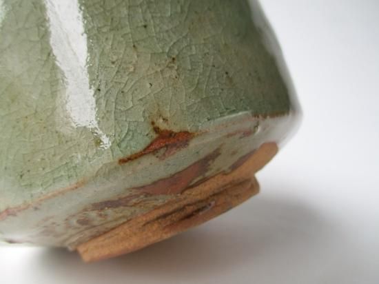 口四方のフォルム、巧みな箆使いの面取り、そして灰釉を得意とした作者の技量がよくあらわれた焼き上がりと見所の多い逸品です。