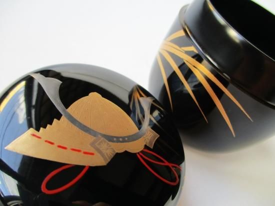 兜と菖蒲がバランスの良い構図で蒔絵されているスッキリとした品のある棗です。