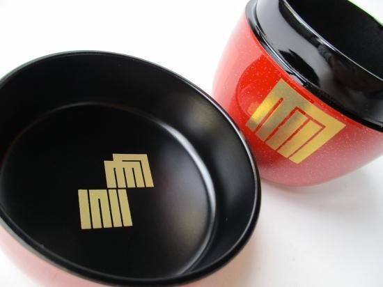 キラキラと光る砂子の朱漆の甲には紫式部、胴と蓋裏に源氏香の蒔絵がプリントされています。