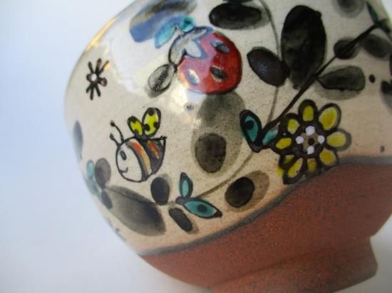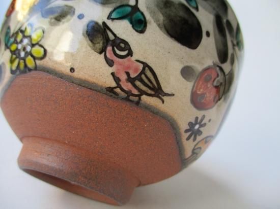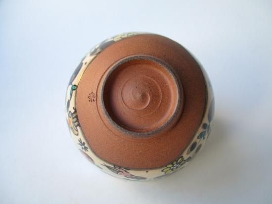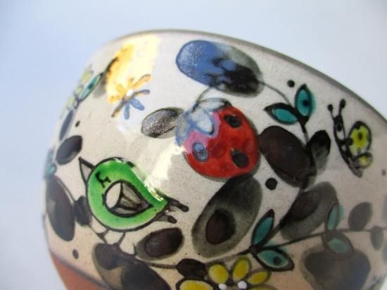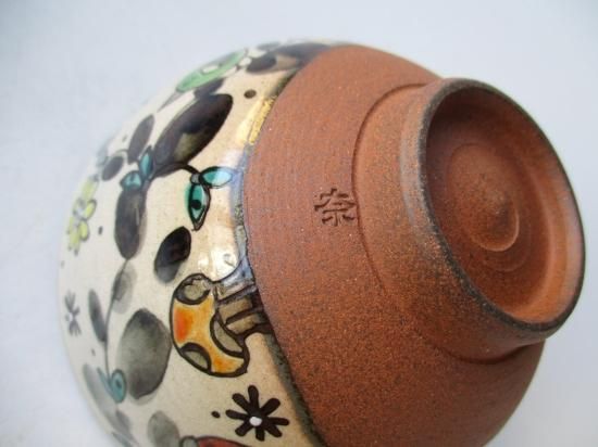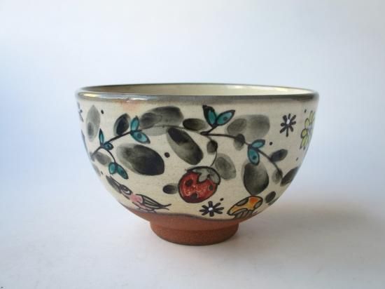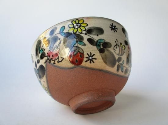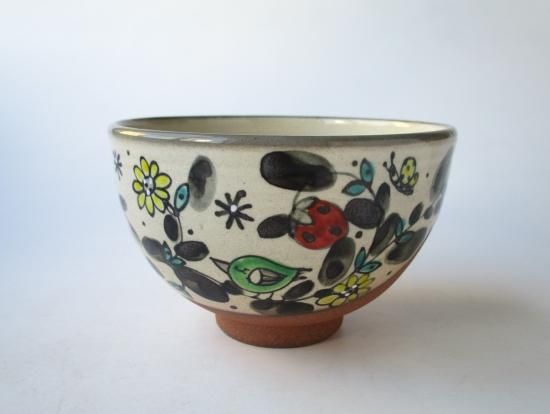 本作品は奈緒さんの作品で、独特の世界観のあるタッチで口元に草花、虫などが描かれたメルヘンチックで愛らしい茶碗です。