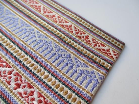 この裂は緻密で色糸を巧みに組織させた段を織り出し、その印度風な華紋などの構成は異国的な風情をもつ文様です。 《栞より》
