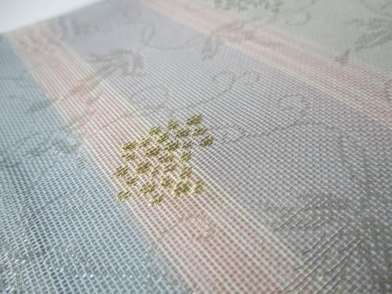 豊かな実、旋回する蔓の優美な文様構成を、紗組織で織り出した裂です。 《栞より》