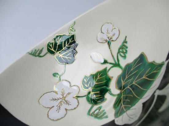 白い部分には綺麗に発色した緑を中心に金と白釉を上手に使ってあり鮮やかに描かれています。