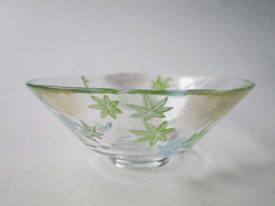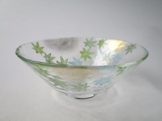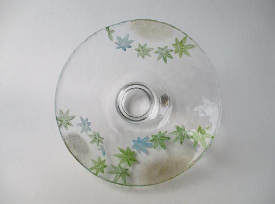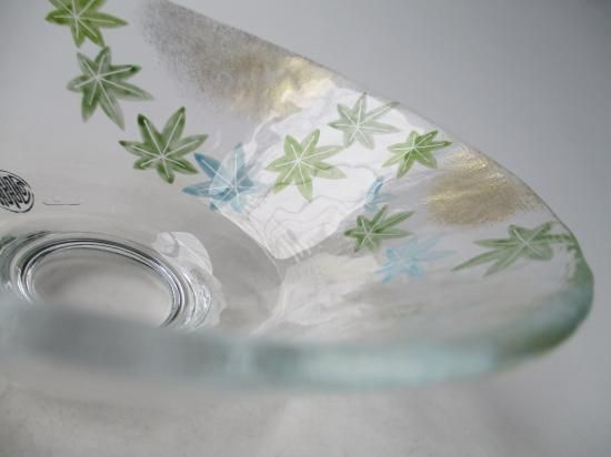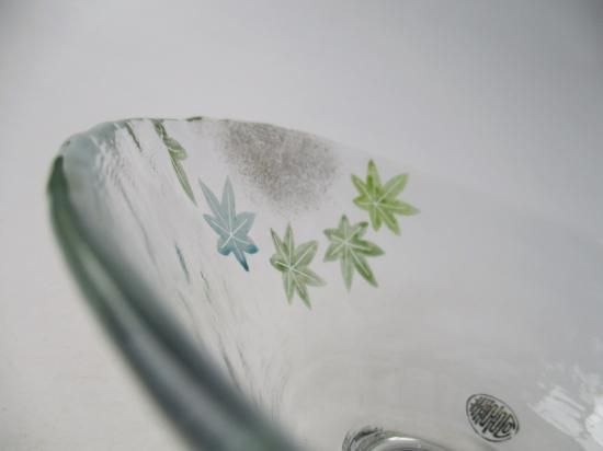 緑と水色の楓が風に舞っているようなデザインで金砂子がアクセントとなっています。