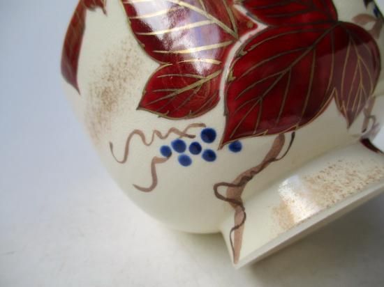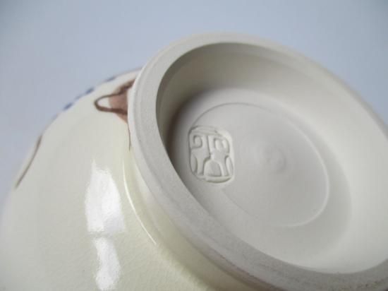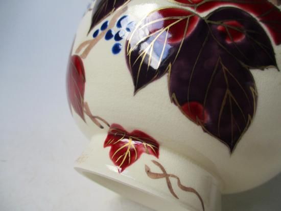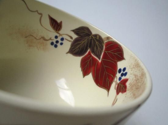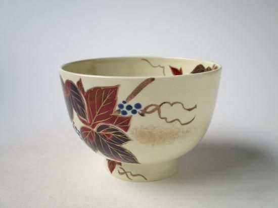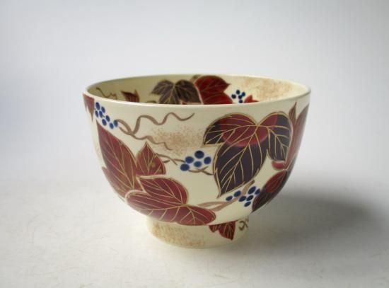 安定感のある撥高台の茶碗に鮮やかに色づいた赤蔦が描かれています。
