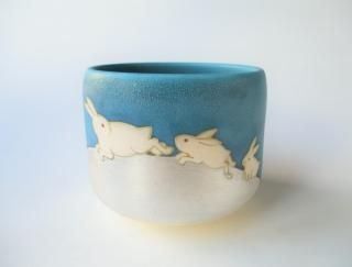 彫って表現してあり青楽釉薬が溜まって濃淡が生まれており、さらに全体に金箔を散らし華やかで雅な雰囲気に仕上げられています。