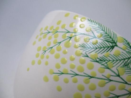 春の訪れを告げる黄色いミモザの花が描かれたスッキリとした品のある可愛らしい茶碗です。
