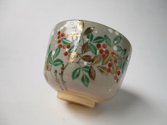 側面には南天とチラチラと降る雪を白い釉薬を盛り上げるようにして描かれており、赤と白そして緑のコントラストが美しく、そして金を上手に使っていることで上品な雰囲気を醸し出しています。