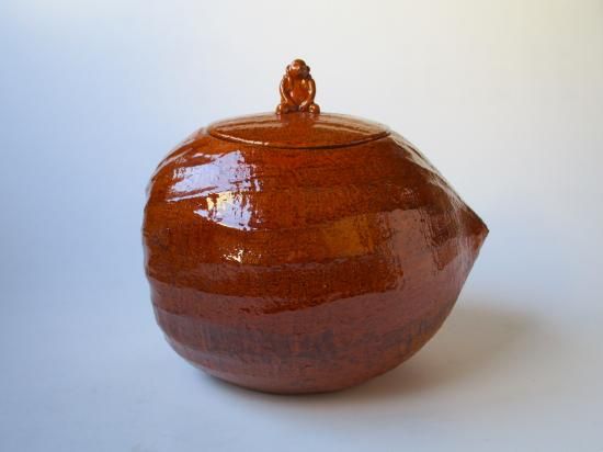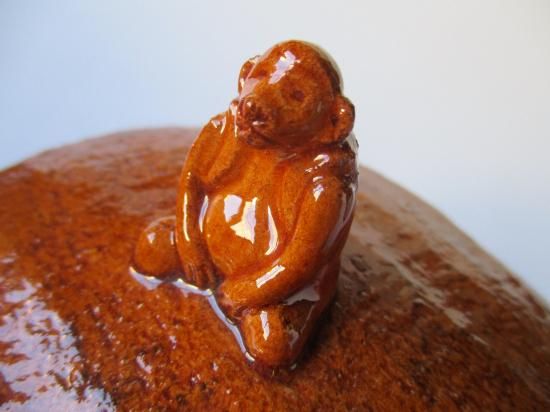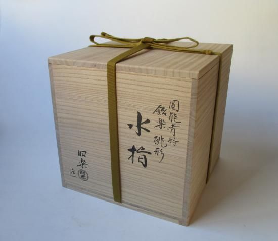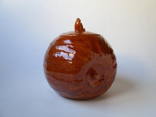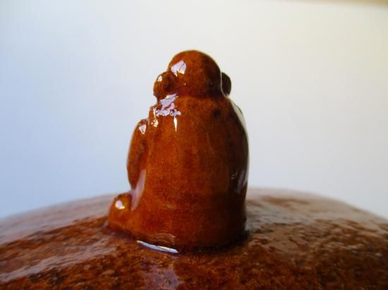 本作品は桃の形を巧みに水指として成形してあり、蓋の摘みが猿になっています。